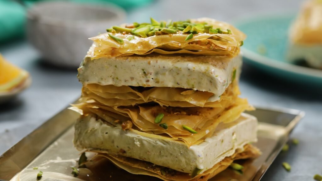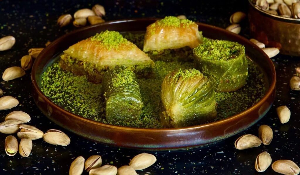 The dish is a sweet dessert and consists of layers of buttery phyllo dough sheets, which are very thin. It is packed with a filling of crushed pistachios or walnuts inside.