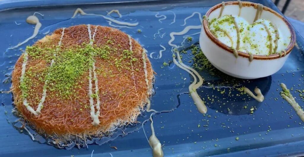 Straight from the pan, it is soaked in sweet fragrant syrup with crushed pistachios on top. When warm, there is a delicious combination of crispy and gooey and sweet and savory when taking bites of Künefe.