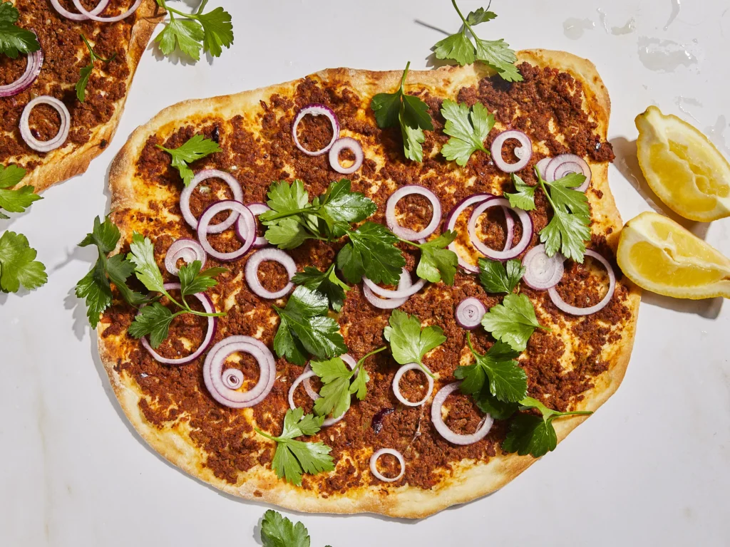 Its name comes from the Arabic phrase “lahma bi ajeen”, which means dough with meat. Similar dishes existed across the Eastern Mediterranean thousands of years ago.